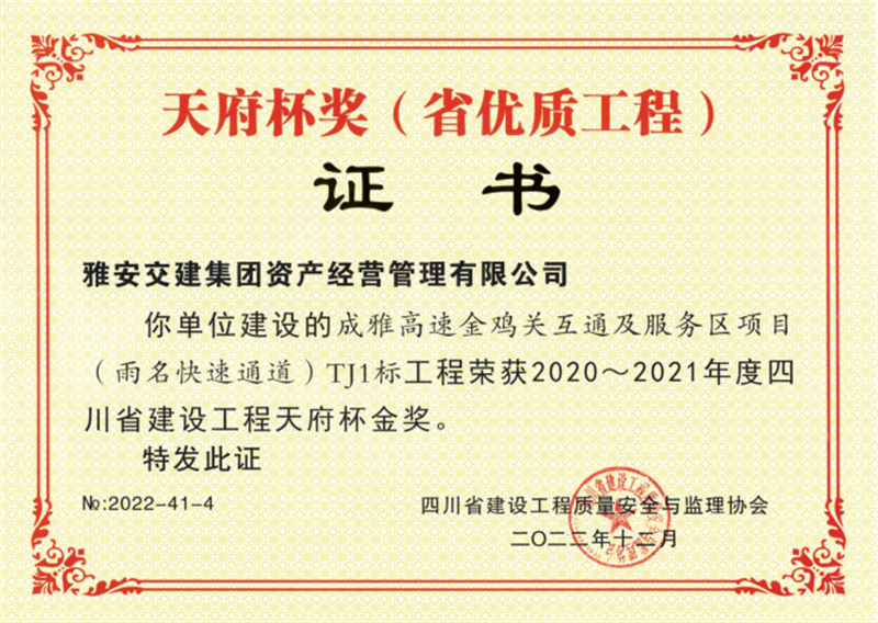 近日,雅安交建集團(tuán)資產(chǎn)經(jīng)營(yíng)管理有限公司建設(shè)的成雅高速金雞關(guān)互通及服務(wù)區(qū)項(xiàng)目(雨名快速通道)TJ1標(biāo)工程榮獲2020-2021年度四川省建設(shè)工程天府杯金獎(jiǎng)。
