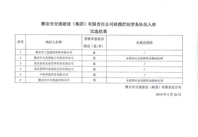 雅安市交通建設(shè)(集團(tuán))有限責(zé)任公司砼攪攔站勞務(wù)隊(duì)伍入庫(kù)比選結(jié)果