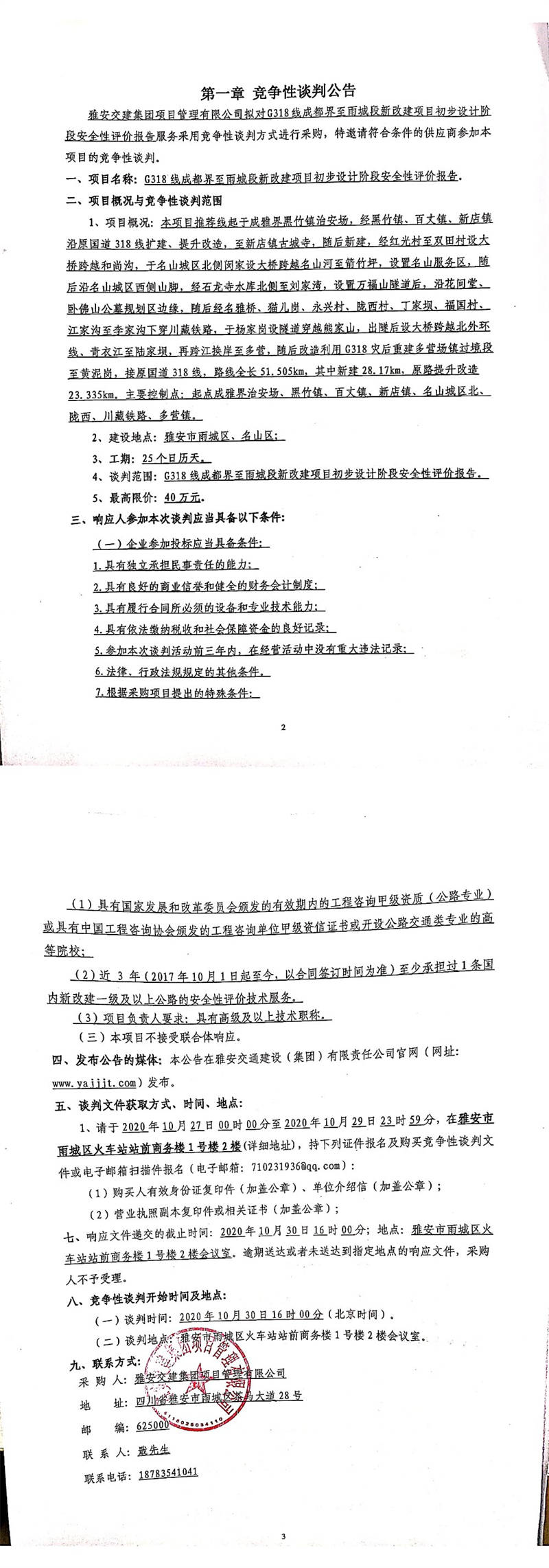 雅安交建集團項目管理有限公司G318線成都界至雨城段新改建項目初步設計階段安全性評價報告競爭性談判公告