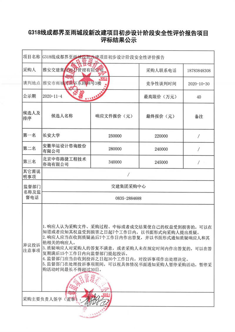 雅安交建集團(tuán)項(xiàng)目管理有限公司G318線成都界至雨城段新改建項(xiàng)目初步設(shè)計(jì)階段安全性評(píng)價(jià)報(bào)告項(xiàng)目評(píng)標(biāo)結(jié)果公示