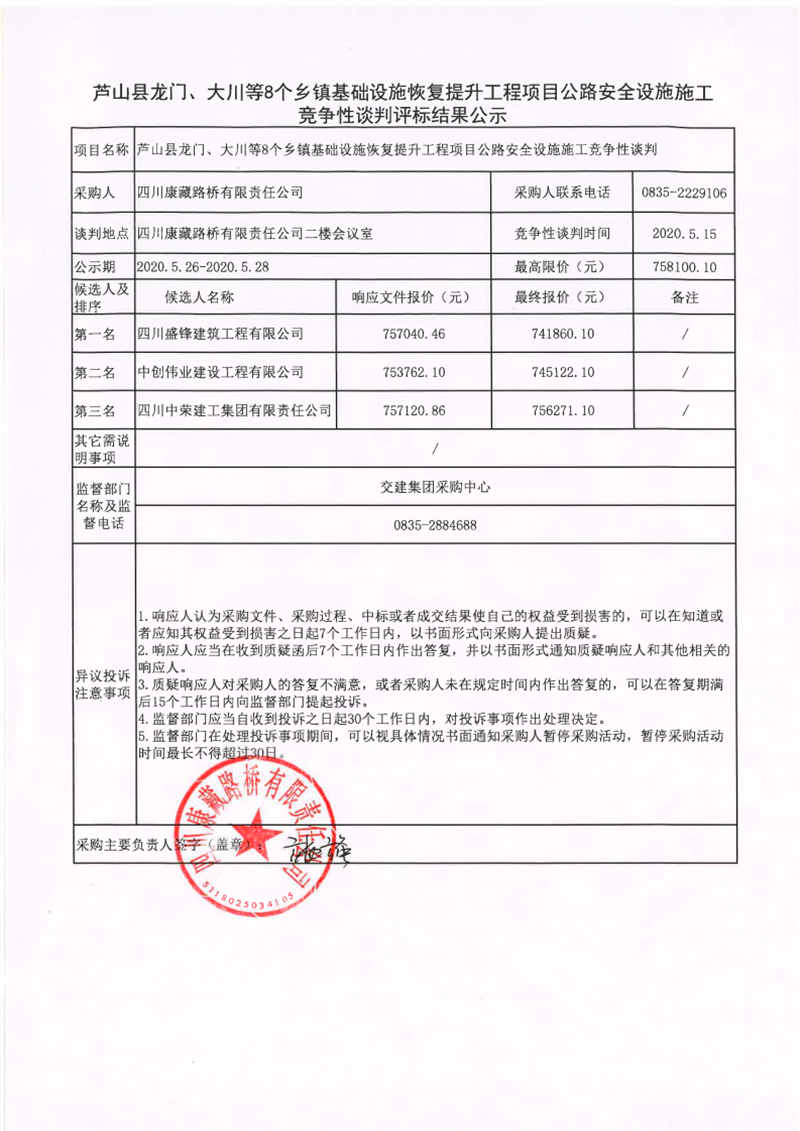 四川康藏路橋有限責(zé)任公司蘆山縣龍門、大川等8個(gè)鄉(xiāng)鎮(zhèn)基礎(chǔ)設(shè)施恢復(fù)提升工程項(xiàng)目公路安全設(shè)施施工競(jìng)爭(zhēng)性談判評(píng)標(biāo)結(jié)果公示