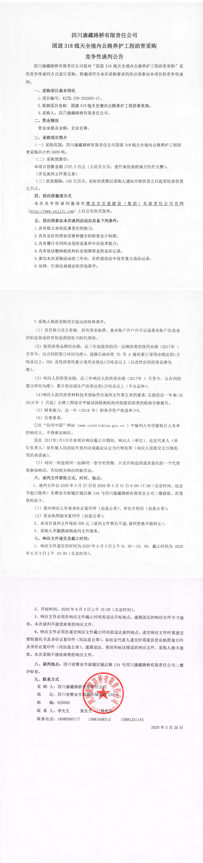 四川康藏路橋有限責(zé)任公司國(guó)道318線天全境內(nèi)公路養(yǎng)護(hù)工程瀝青采購(gòu)競(jìng)爭(zhēng)性談判公告