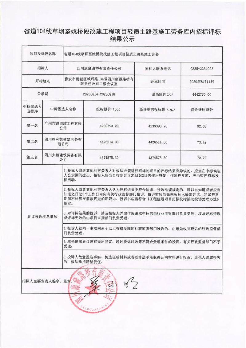 四川康藏路橋有限責(zé)任公司省道104線草壩至姚橋段改建工程項目輕質(zhì)土路基施工勞務(wù)庫內(nèi)招標(biāo)評標(biāo)結(jié)果公示