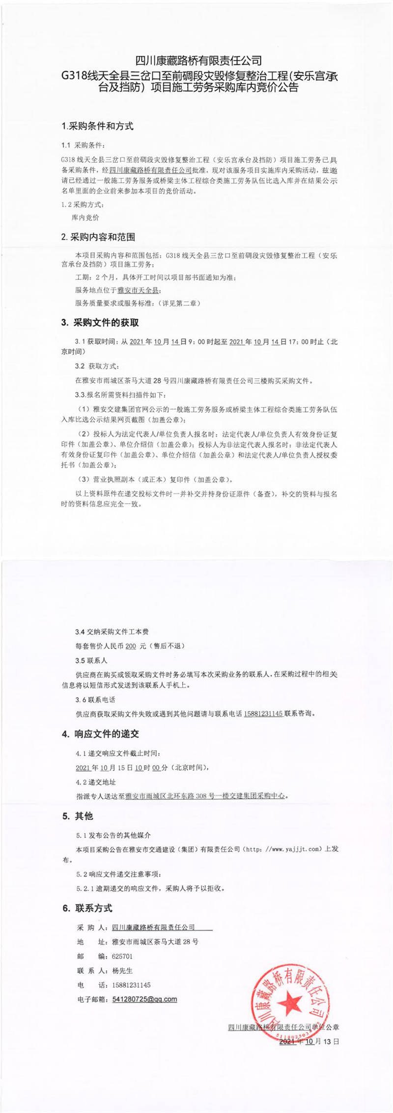 四川康藏路橋有限責(zé)任公司G318線天全縣三岔口至前碉段災(zāi)毀修復(fù)整治工程(安樂宮承臺(tái)及擋防)項(xiàng)目施工勞務(wù)采購庫內(nèi)競價(jià)公告