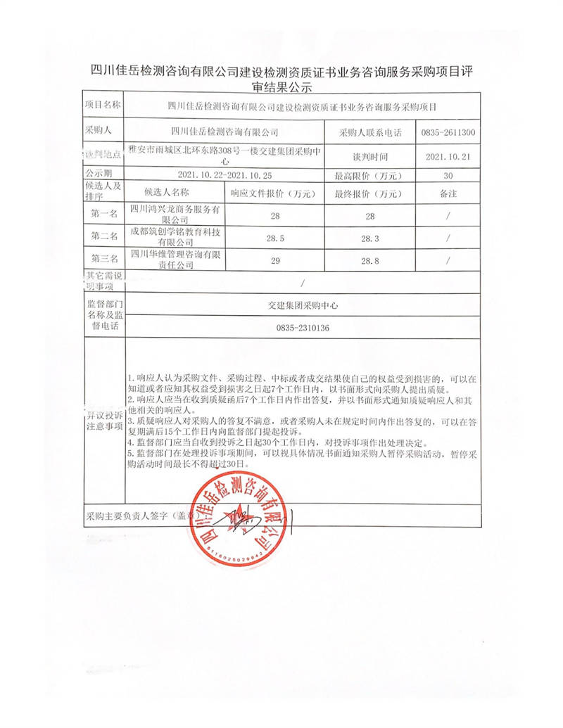 四川佳岳檢測(cè)咨詢(xún)有限公司建設(shè)檢測(cè)資質(zhì)證書(shū)業(yè)務(wù)咨詢(xún)服務(wù)采購(gòu)項(xiàng)目評(píng)審結(jié)果公示