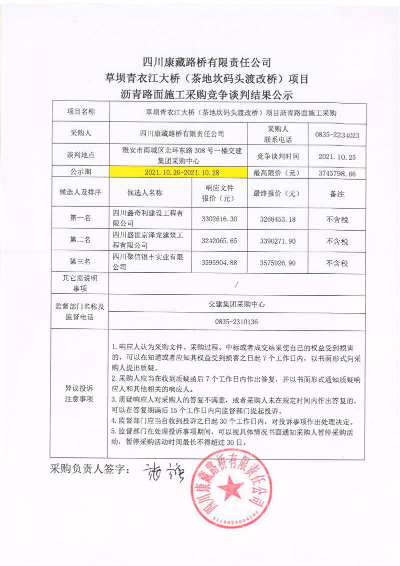 四川康藏路橋有限責(zé)任公司草壩青衣江大橋(茶地坎碼頭渡改橋)項(xiàng)目瀝青路面施工采購競(jìng)爭談判結(jié)果公示