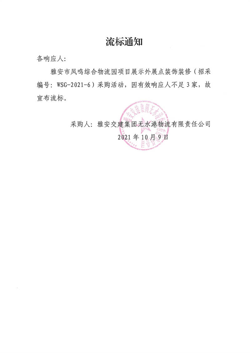 雅安交建集團無水港物流有限責任公司雅安市鳳鳴綜合物流園項目展示外展點裝飾裝修流標通知
