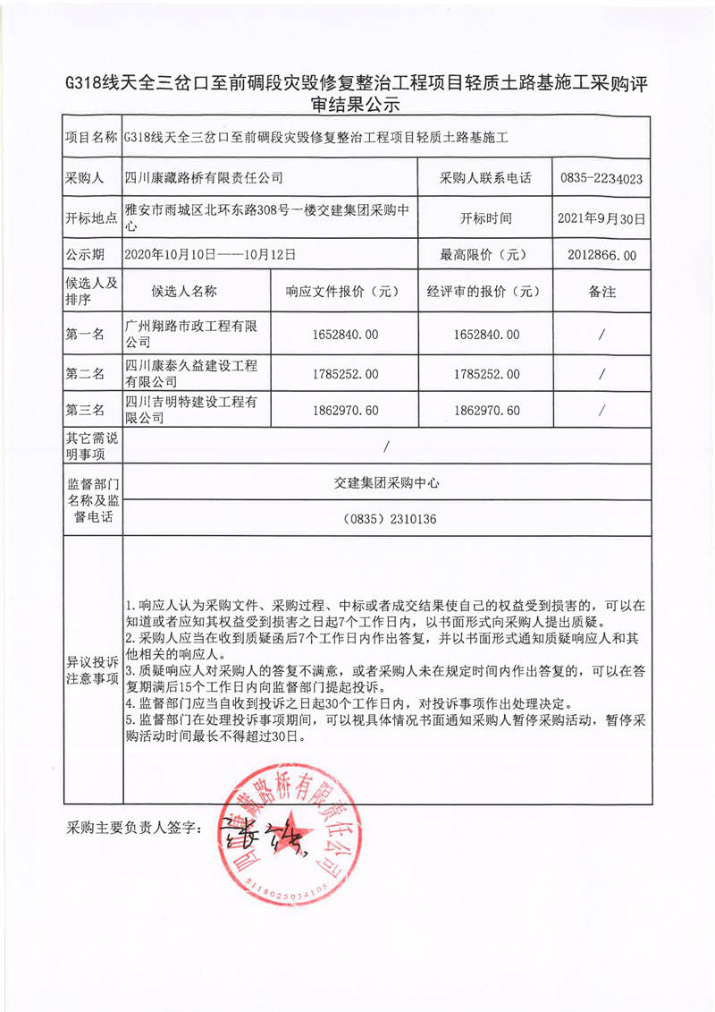 四川康藏路橋有限責(zé)任公司G318線天全三岔口至前碉段災(zāi)毀修復(fù)整治工程項(xiàng)目輕質(zhì)土路基施工采購評(píng)審結(jié)果公示