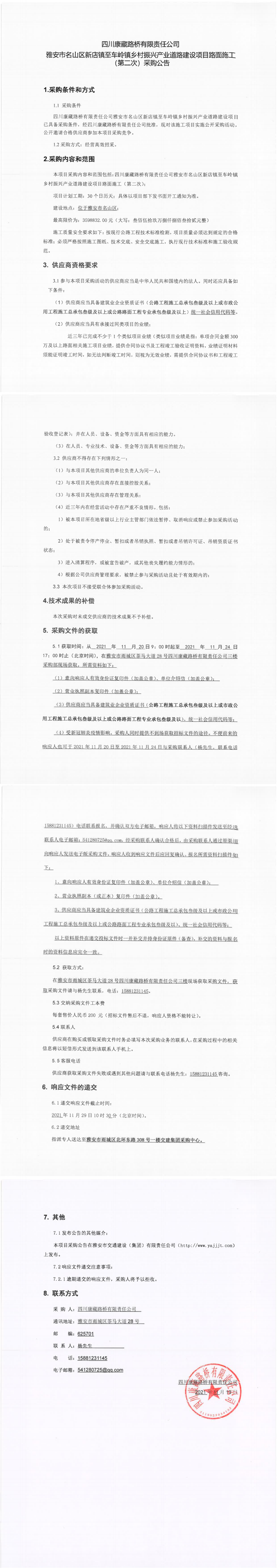 四川康藏路橋有限責任公司雅安市名山區(qū)新店鎮(zhèn)至車嶺鎮(zhèn)鄉(xiāng)村振興產(chǎn)業(yè)道路建設(shè)項目路面施工(第二次)采購公告