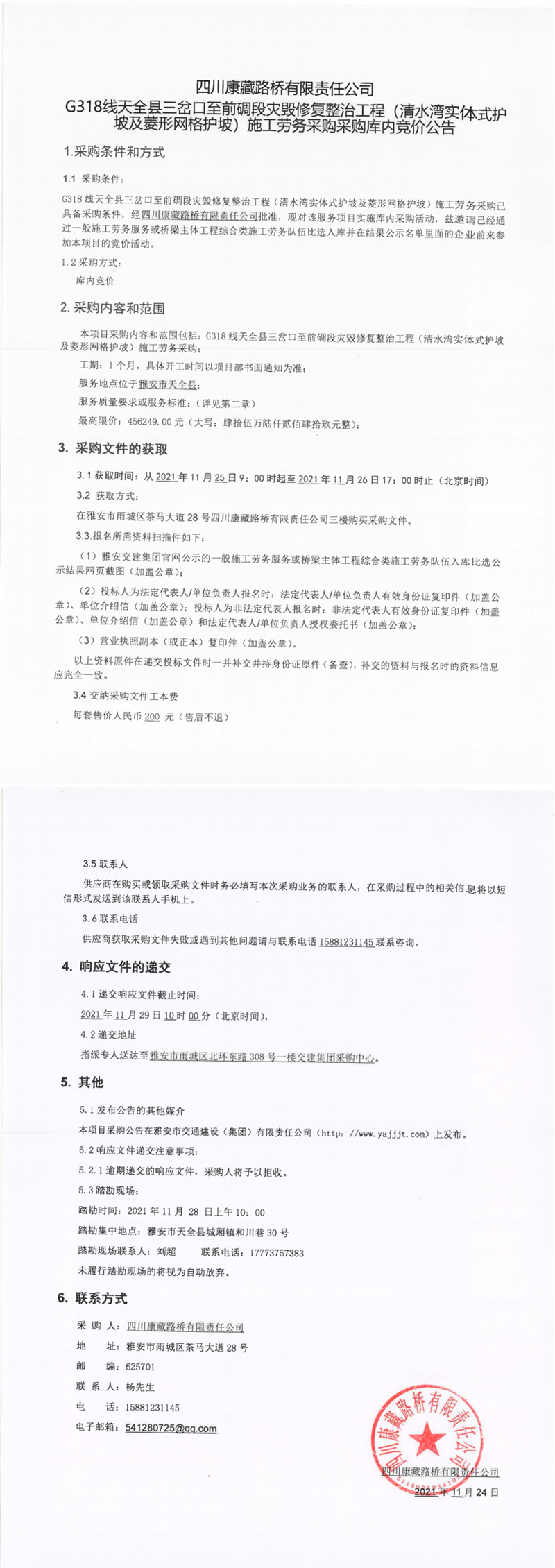 四川康藏路橋有限責(zé)任公司G318線天全縣三岔口至前碉段災(zāi)毀修復(fù)整治工程(清水灣實(shí)體式護(hù)坡及菱形網(wǎng)格護(hù)坡)施工勞務(wù)采購(gòu)采購(gòu)庫(kù)內(nèi)競(jìng)價(jià)公告
