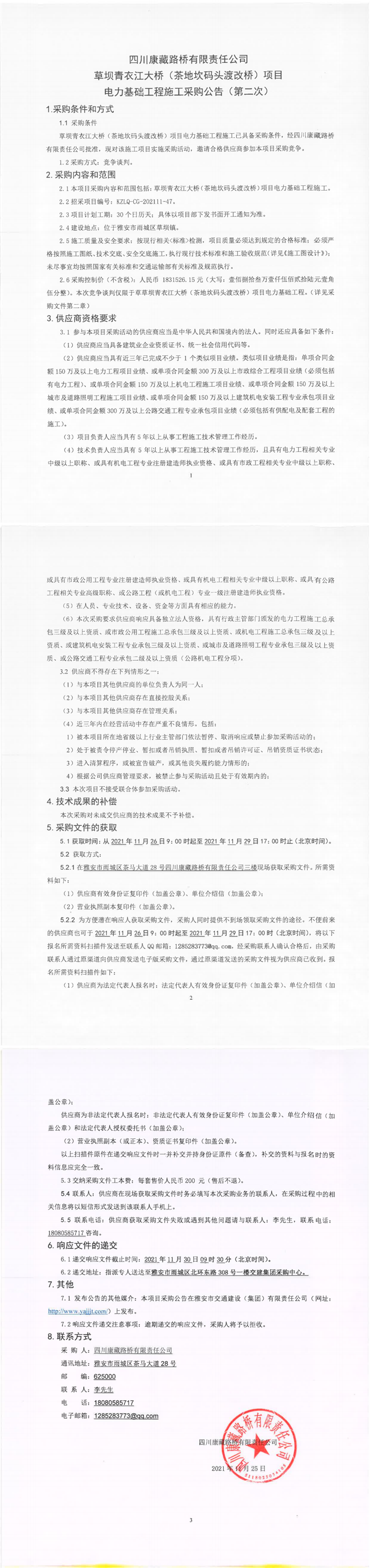 四川康藏路橋有限責任公司草壩青衣江大橋(茶地坎碼頭渡改橋)項目電力基礎工程施工采購公告(第二次)