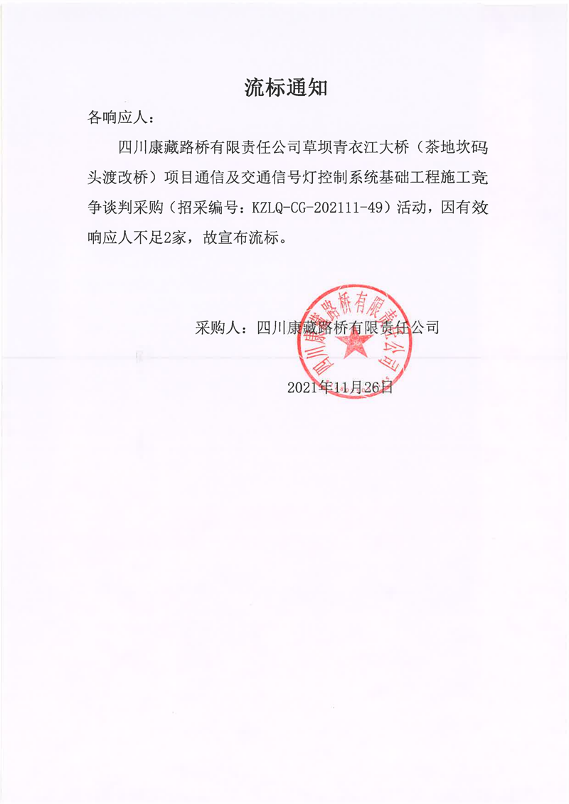 四川康藏路橋有限責(zé)任公司草壩青衣江大橋(茶地坎碼頭渡改橋)項目通信及交通信號燈控制系統(tǒng)基礎(chǔ)工程施工采購流標(biāo)通知