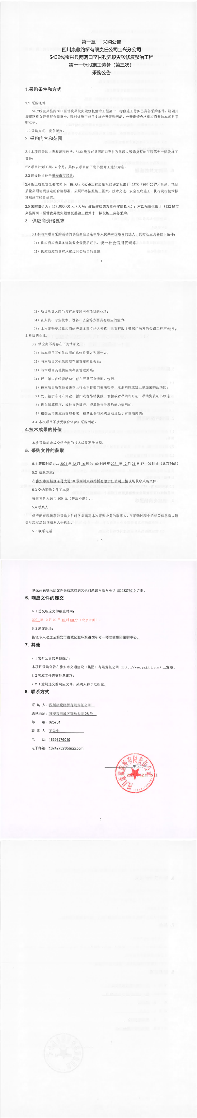 四川康藏路橋有限責任公司S432線寶興縣兩河口至甘孜界段災毀修復整治工程第十二標段施工勞務經(jīng)營高效招采結果公示