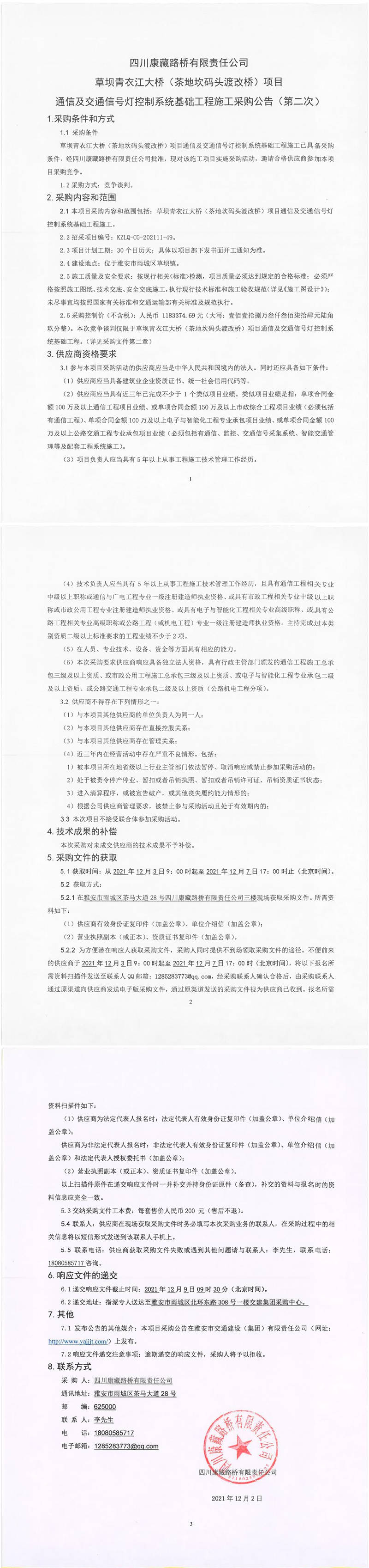 四川康藏路橋有限責任公司草壩青衣江大橋(茶地坎碼頭渡改橋)項目通信及交通信號燈控制系統(tǒng)基礎工程施工采購公告(第二次)