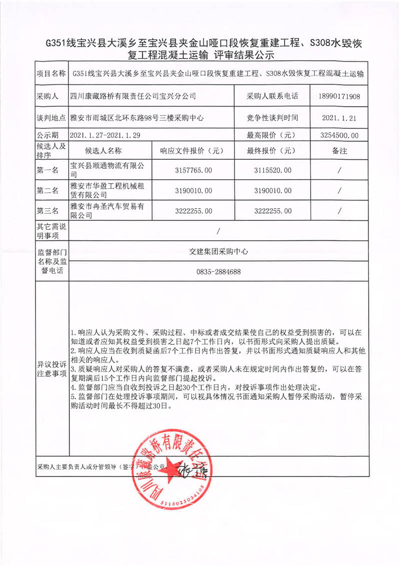 四川康藏路橋有限責(zé)任公司寶興分公司G351線寶興縣大溪鄉(xiāng)至寶興縣夾金山啞口段恢復(fù)重建工程、S308水毀恢復(fù)工程混凝土運(yùn)輸評審結(jié)果公示