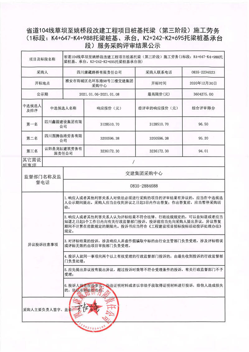 四川康藏路橋有限責(zé)任公司省道104線草壩至姚橋段改建工程項(xiàng)目樁基托梁(第三階段)施工勞務(wù)服務(wù)1標(biāo)段采購(gòu)評(píng)審結(jié)果公示