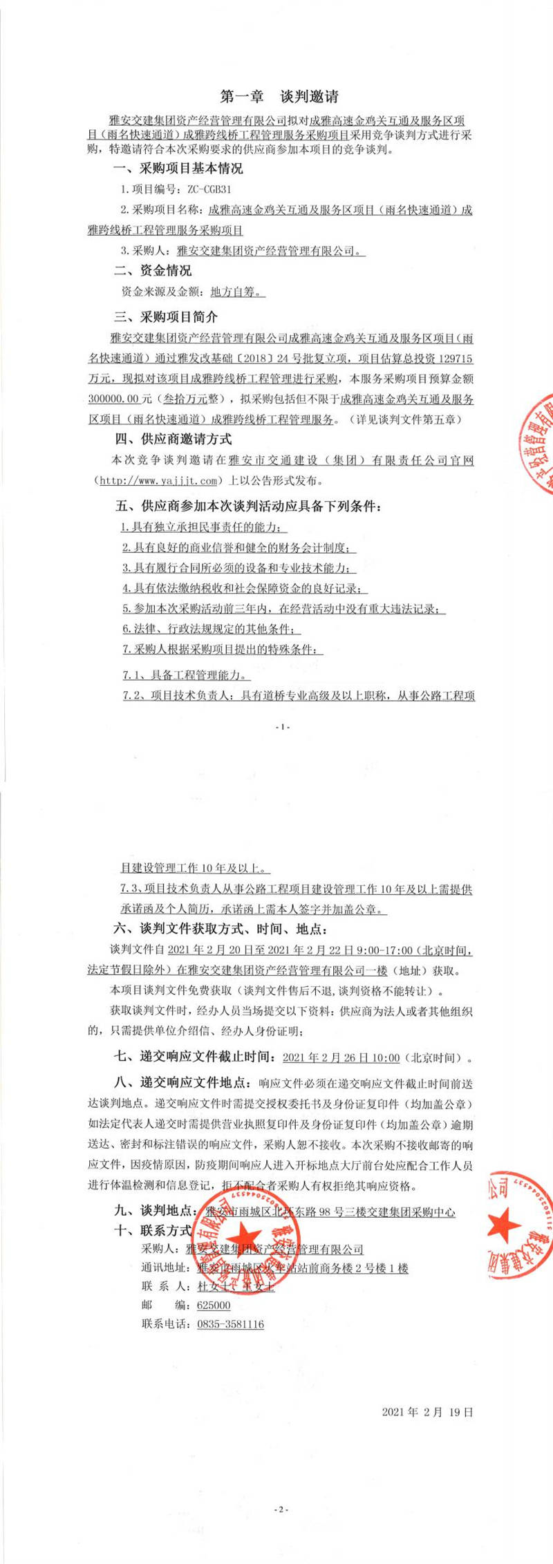 雅安交建集團(tuán)資產(chǎn)經(jīng)營(yíng)管理有限公司成雅高速金雞關(guān)互通及服務(wù)區(qū)項(xiàng)目(雨名快速通道)成雅跨線(xiàn)橋工程管理服務(wù)采購(gòu)項(xiàng)目競(jìng)爭(zhēng)談判公告