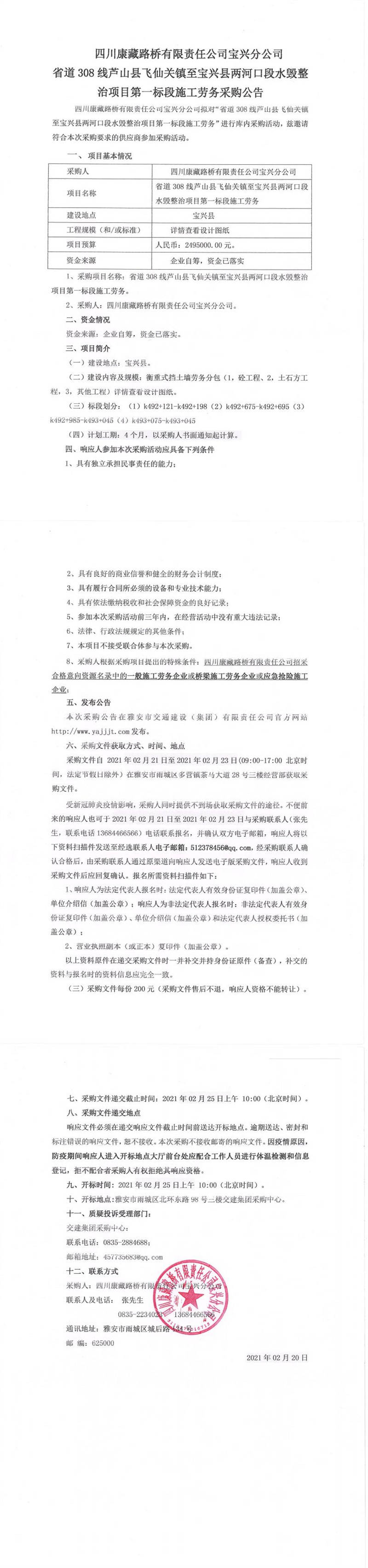 四川康藏路橋有限責(zé)任公司寶興分公司省道308線蘆山縣飛仙關(guān)鎮(zhèn)至寶興縣兩河口段水毀整治項(xiàng)目第一標(biāo)段施工勞務(wù)采購(gòu)公告