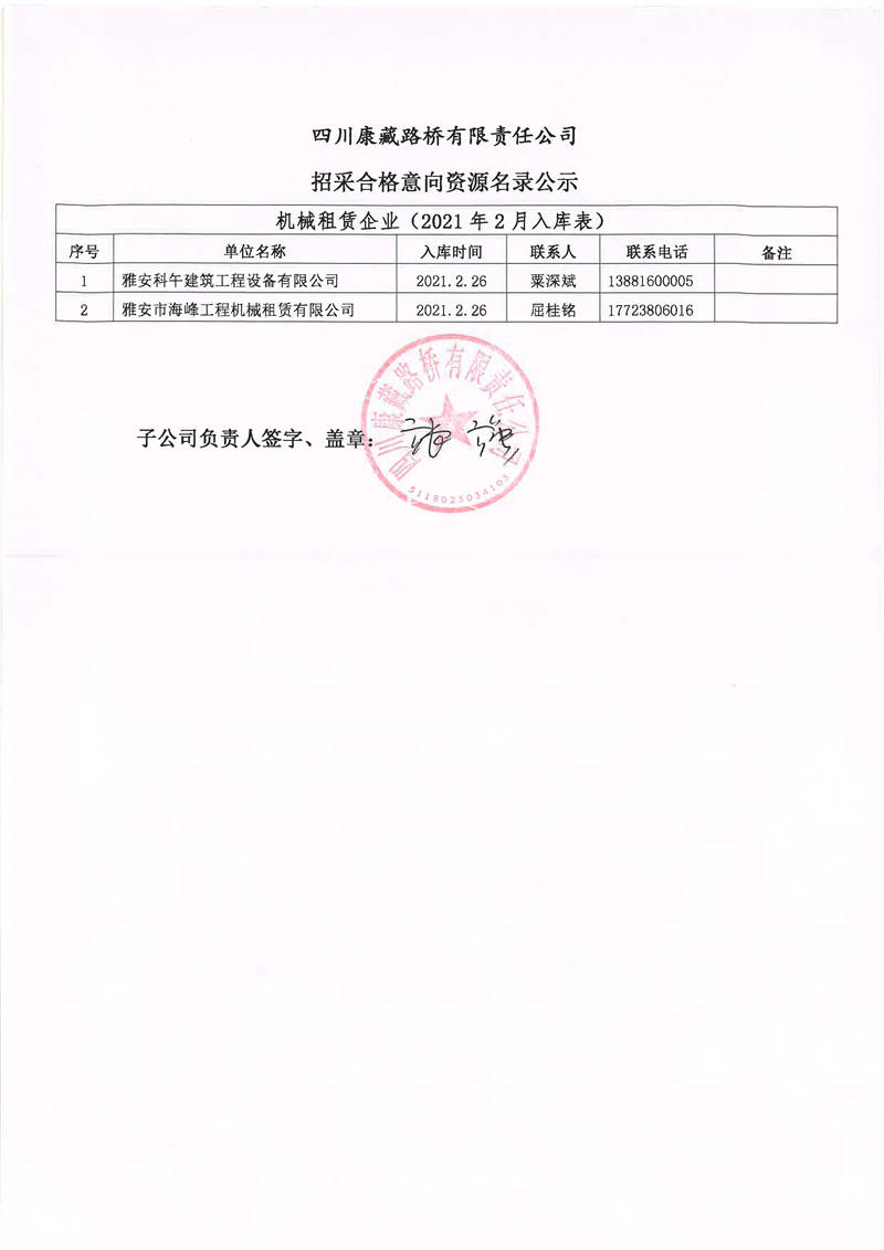 四川康藏路橋有限責(zé)任公司招采合格意向資源名錄補錄公示