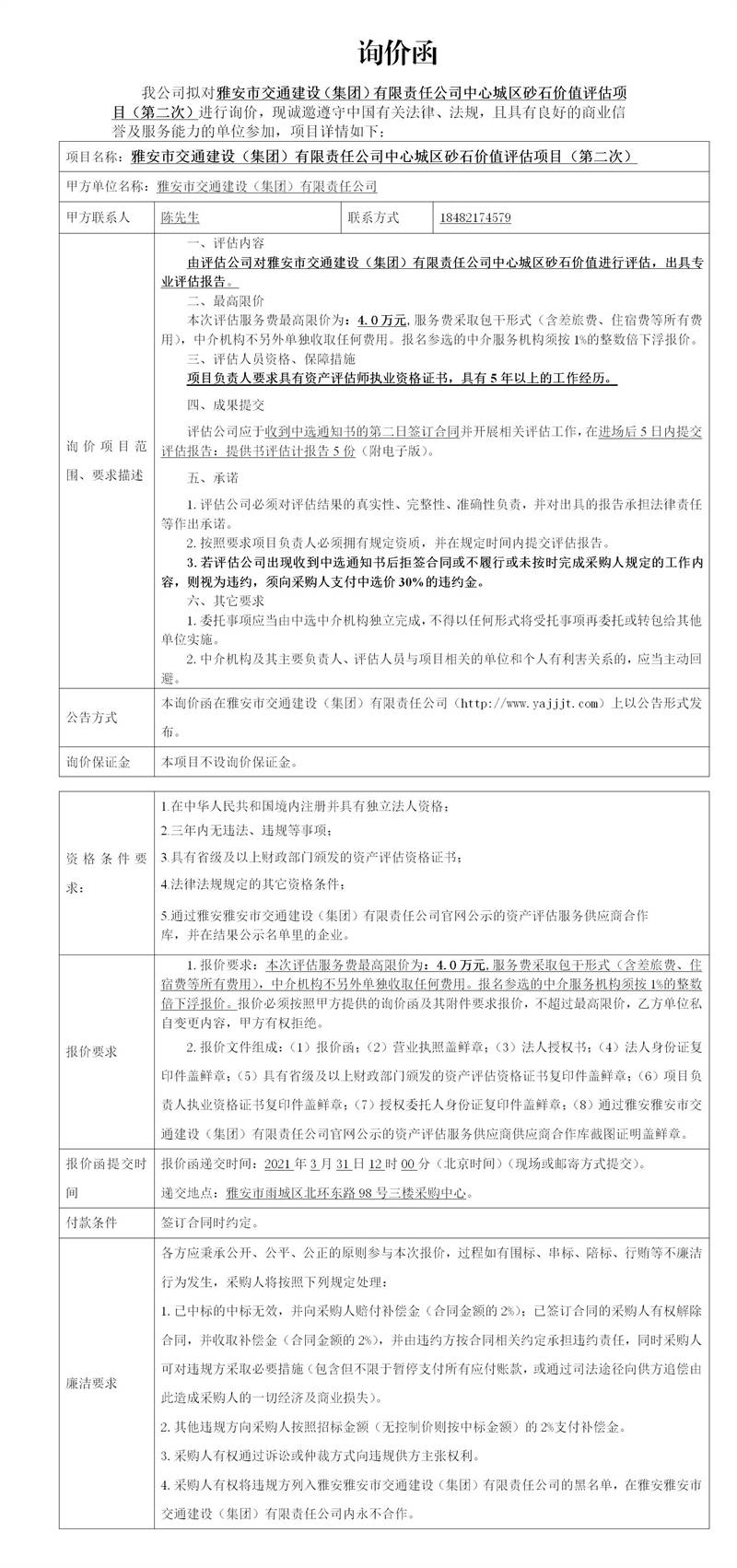 雅安市交通建設(shè)(集團(tuán))有限責(zé)任公司中心城區(qū)砂石價值評估項目(第二次)詢價函