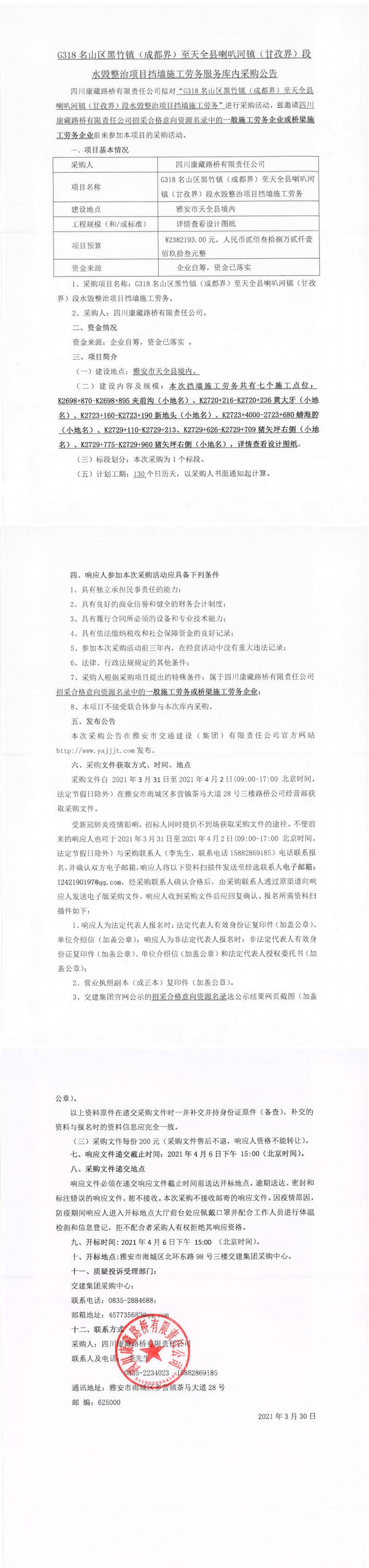 四川康藏路橋有限責任公司G318名山區(qū)黑竹鎮(zhèn)(成都界)至天全縣喇叭河鎮(zhèn)(甘孜界)段水毀整治項目擋墻施工勞務(wù)服務(wù)庫內(nèi)采購公告