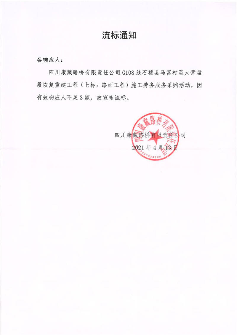 四川康藏路橋有限責(zé)任公司G108線石棉縣馬富村至大營(yíng)盤段恢復(fù)重建工程(七標(biāo):路面工程)施工勞務(wù)服務(wù)流標(biāo)通知