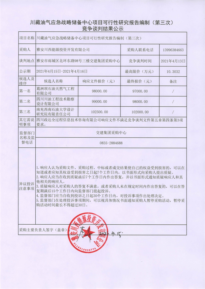雅安川西能源投資開發(fā)有限公司川藏油氣應(yīng)急戰(zhàn)略儲備中心項(xiàng)目可行性研究報(bào)告編制 (第三次)競爭談判結(jié)果公示