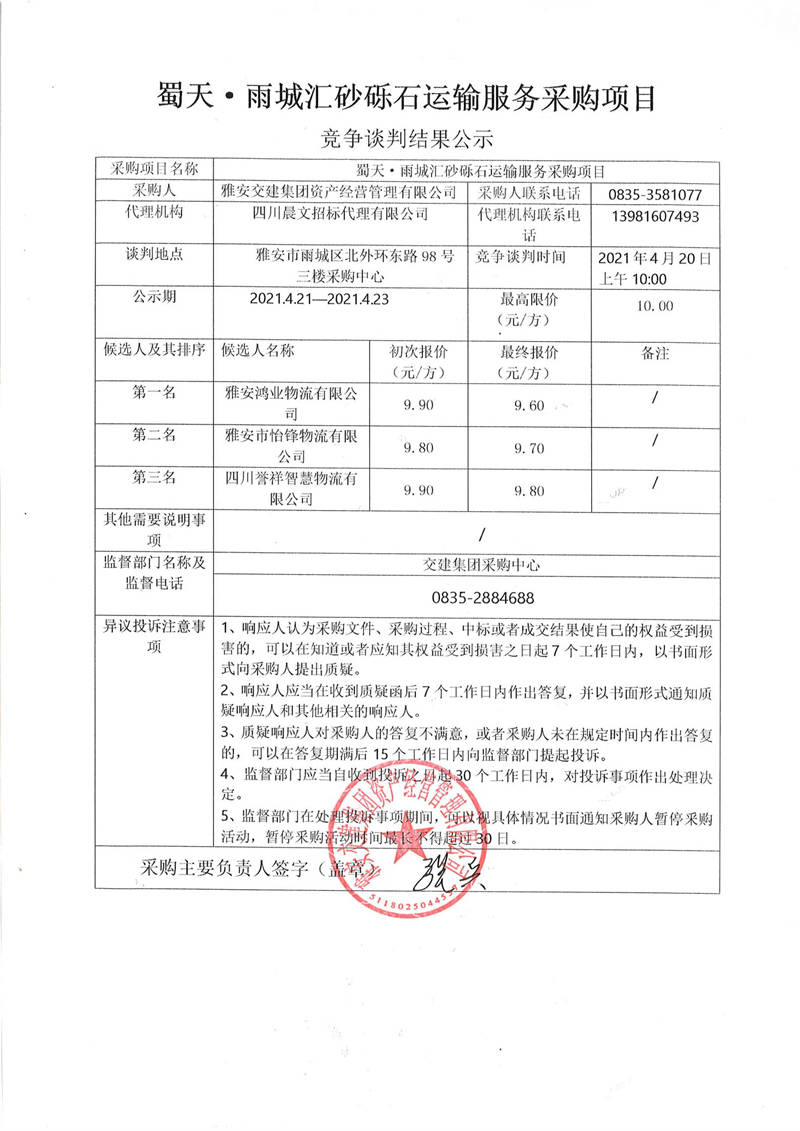 雅安交建集團(tuán)資產(chǎn)經(jīng)營管理有限公司蜀天.雨城匯砂礫石運輸服務(wù)采購項目競爭談判結(jié)果公示
