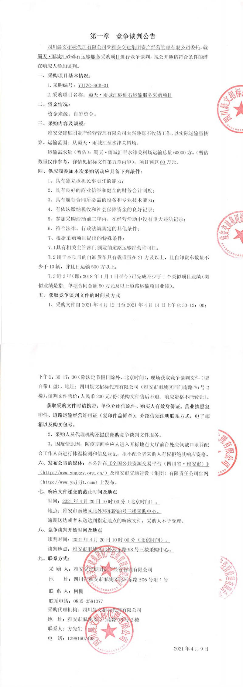 雅安交建集團(tuán)資產(chǎn)經(jīng)營管理有限公司蜀天.雨城匯砂礫石運(yùn)輸服務(wù)采購項目競爭談判公告