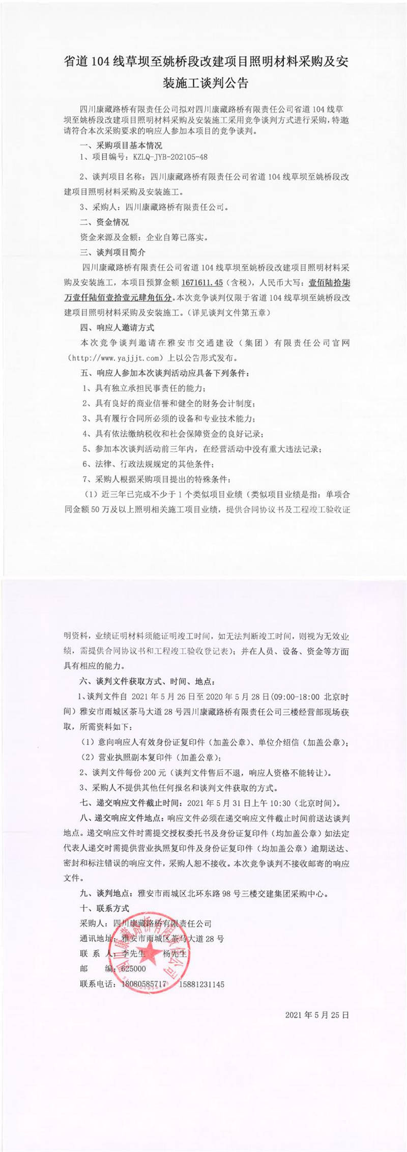 四川康藏路橋有限責(zé)任公司省道104線草壩至姚橋段改建項目照明材料采購及安裝施工談判公告