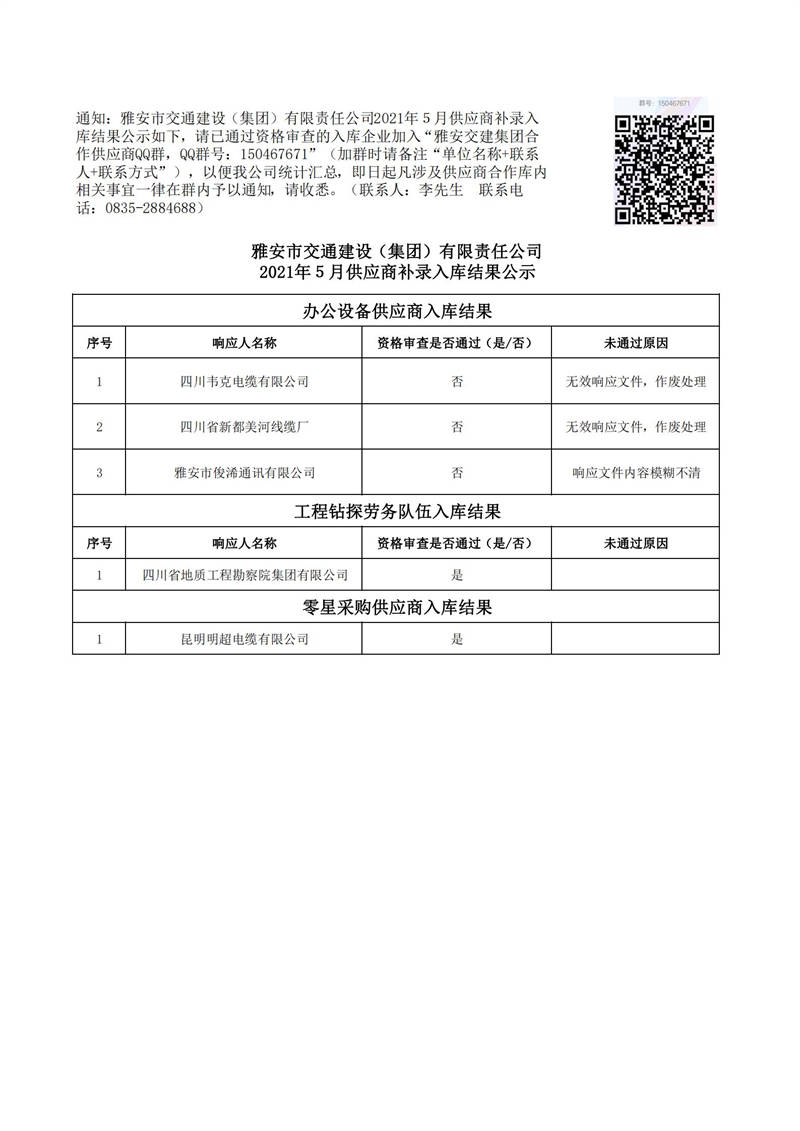 雅安市交通建設(集團)有限責任公司2021年5月供應商補錄入庫結果公示