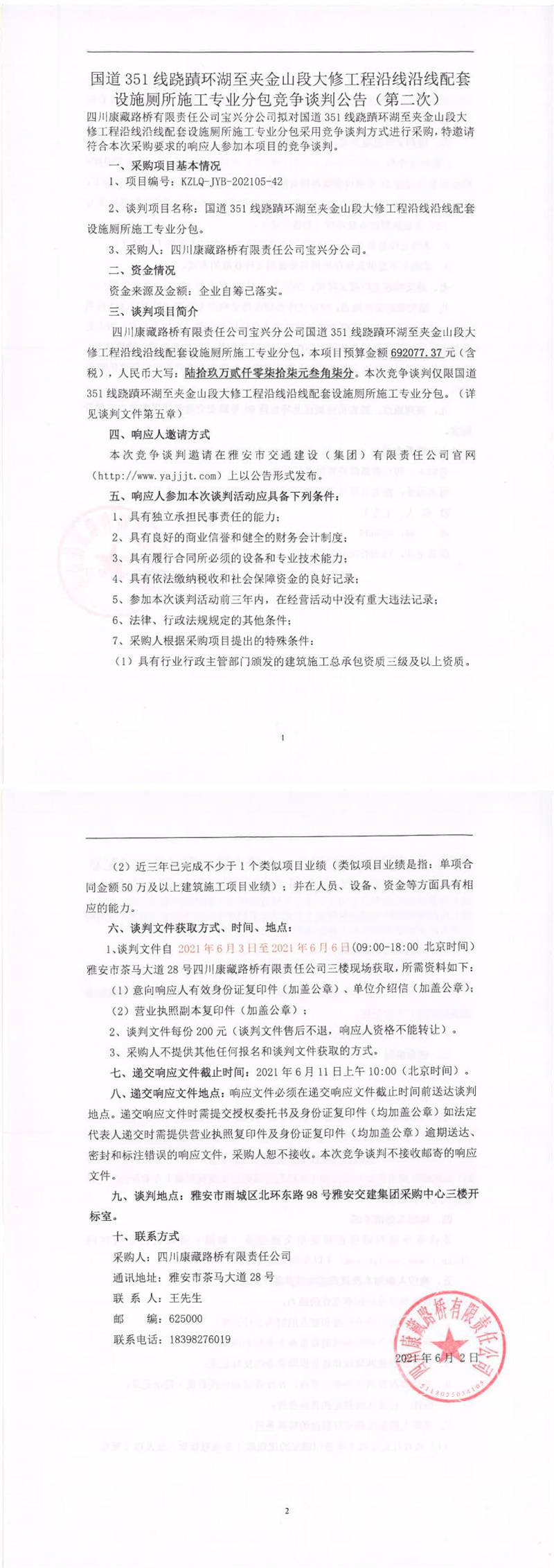 四川康藏路橋有限責(zé)任公司寶興分公司國(guó)道351線蹺磧環(huán)湖至夾金山段大修工程沿線沿線配套設(shè)施廁所施工專(zhuān)業(yè)分包競(jìng)爭(zhēng)談判公告(第二次)