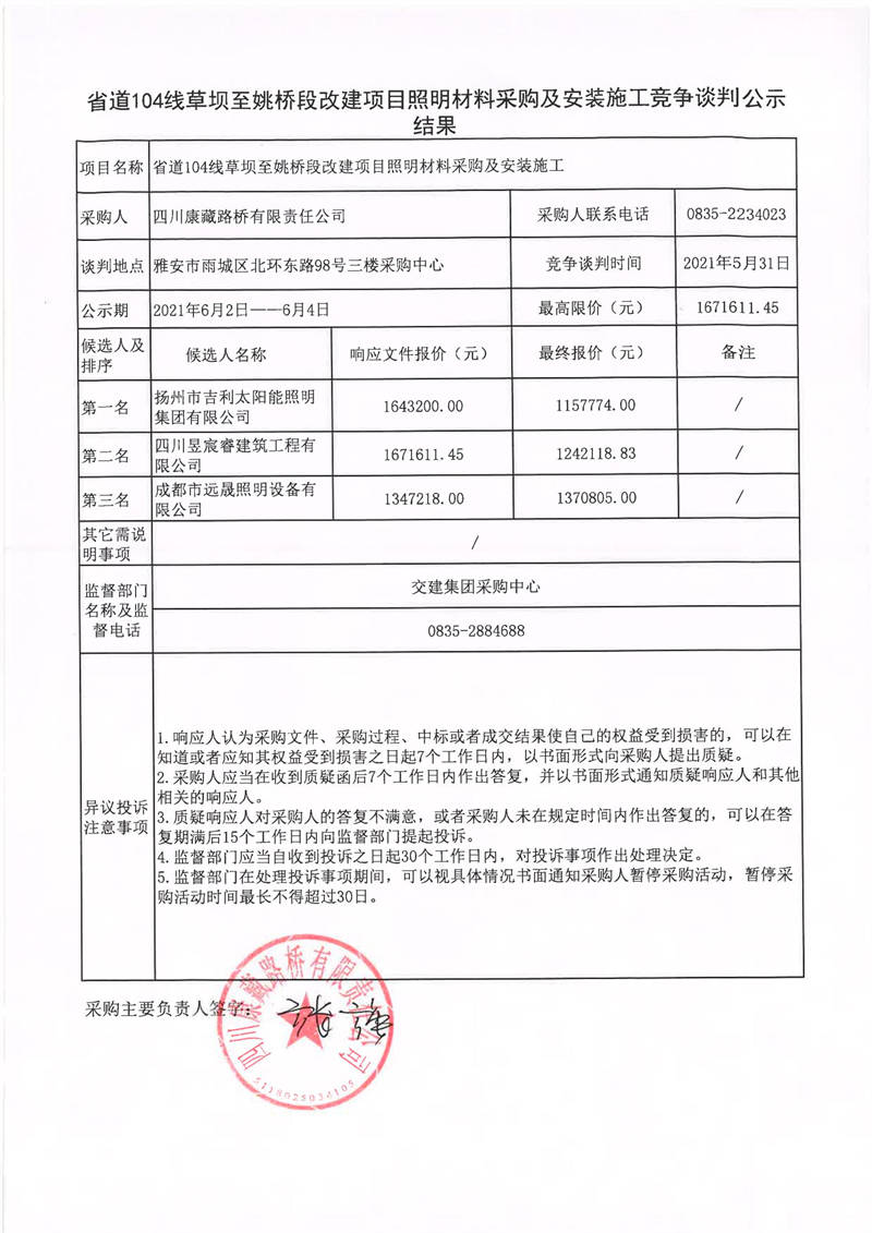 四川康藏路橋有限責(zé)任公司省道104線草壩至姚橋段改建項(xiàng)目照明材料采購(gòu)及安裝施工競(jìng)爭(zhēng)談判公示結(jié)果