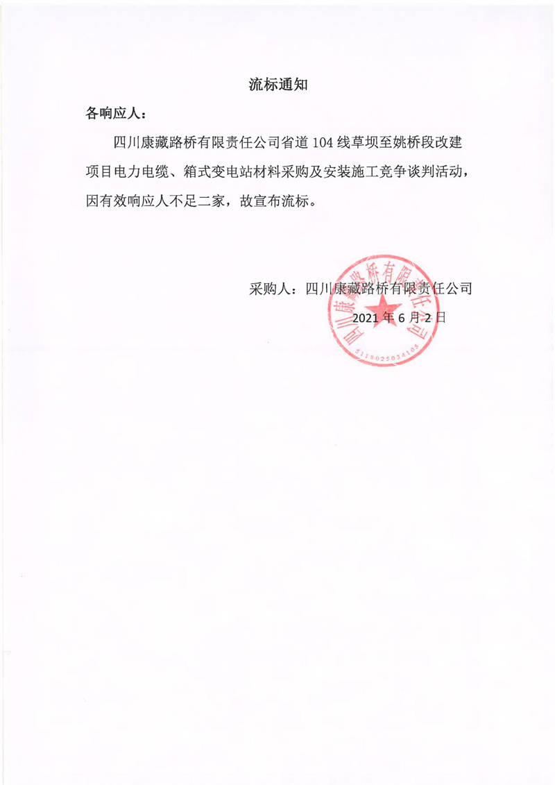 四川康藏路橋有限責任公司省道104線草壩至姚橋段改建項目電力電纜、箱式變電站材料采購及安裝施工競爭談判流標通知