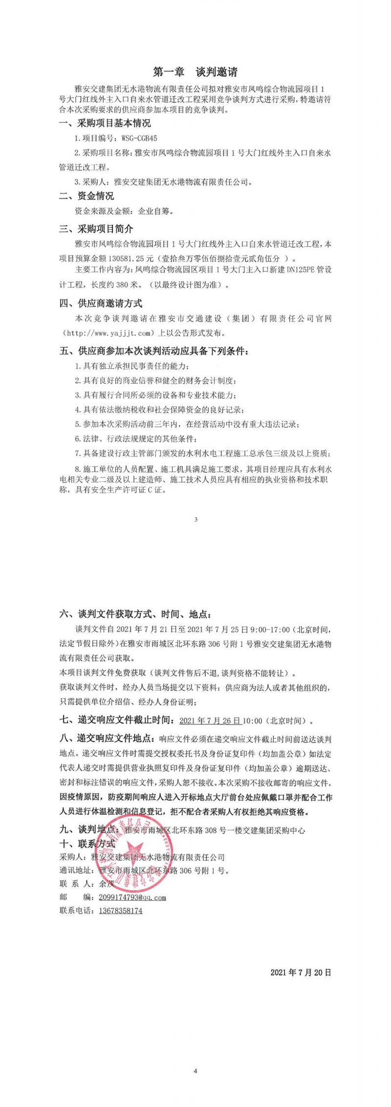 雅安交建集團(tuán)無(wú)水港物流有限責(zé)任公司雅安市鳳鳴綜合物流園項(xiàng)目1號(hào)大門(mén)紅線外主入口自來(lái)水管道遷改工程競(jìng)爭(zhēng)談判公告