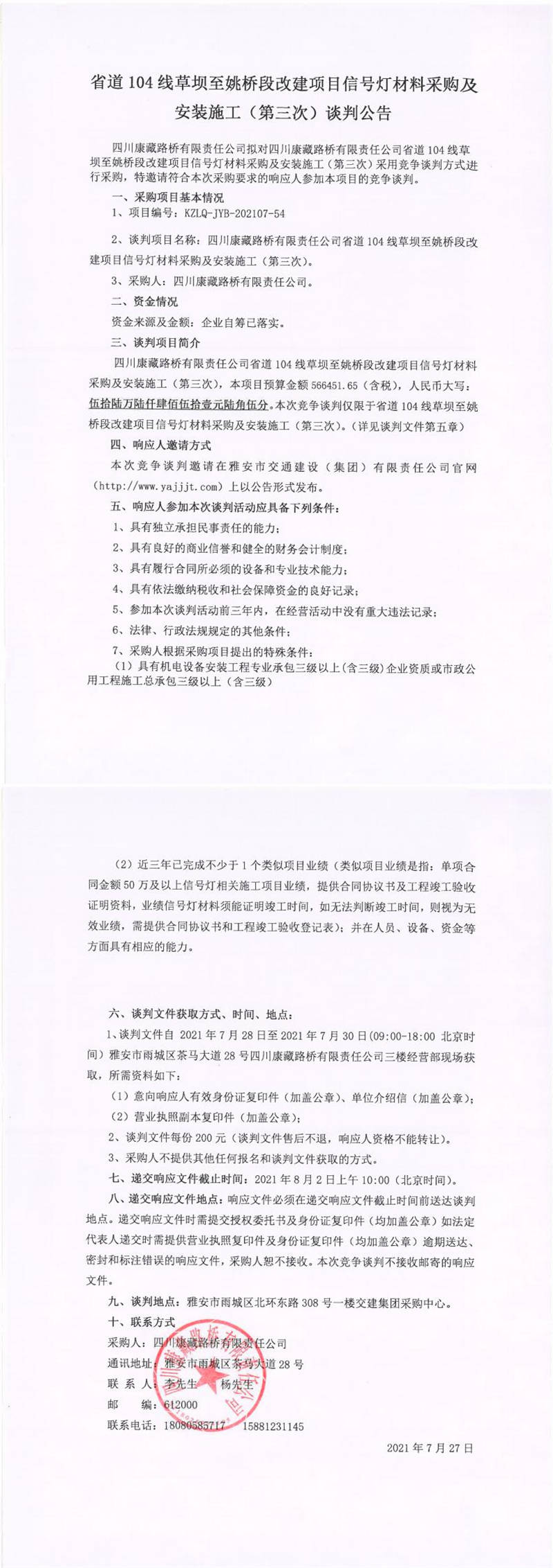 四川康藏路橋有限責(zé)任公司省道104線草壩至姚橋段改建項(xiàng)目信號(hào)燈材料采購(gòu)及安裝施工(第三次)談判公告