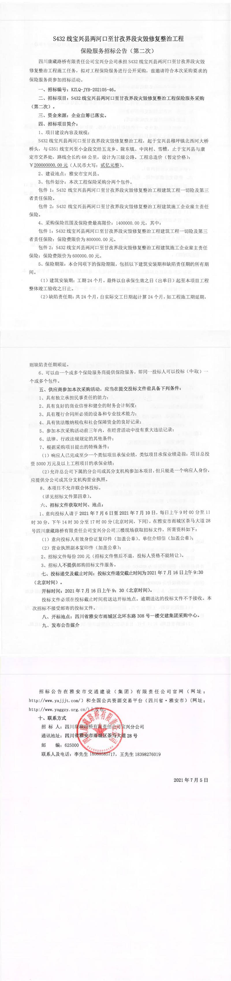 四川康藏路橋有限責(zé)任公司S432線(xiàn)寶興縣兩河口至甘孜界段災(zāi)毀修復(fù)整治工程保險(xiǎn)服務(wù)招標(biāo)公告(第二次)