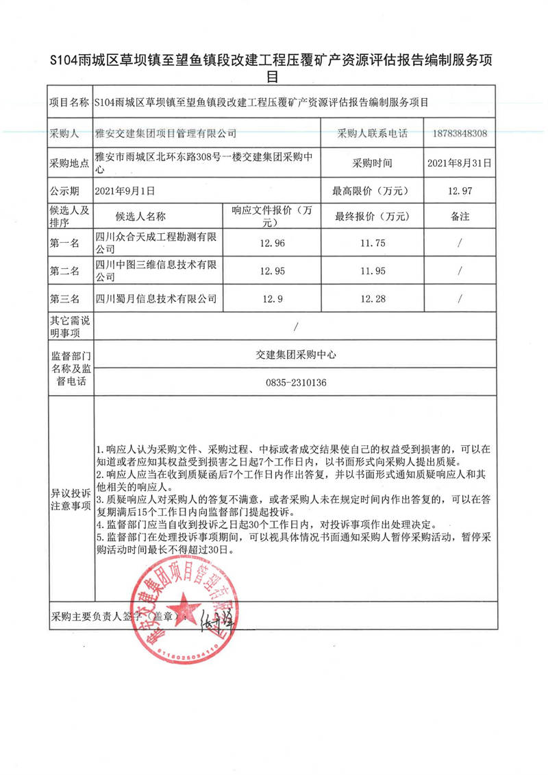 雅安交建集團(tuán)項(xiàng)目管理有限公司S104雨城區(qū)草壩鎮(zhèn)至望魚鎮(zhèn)段改建工程壓覆礦產(chǎn)資源評估報(bào)告編制服務(wù)項(xiàng)目評審結(jié)果公示