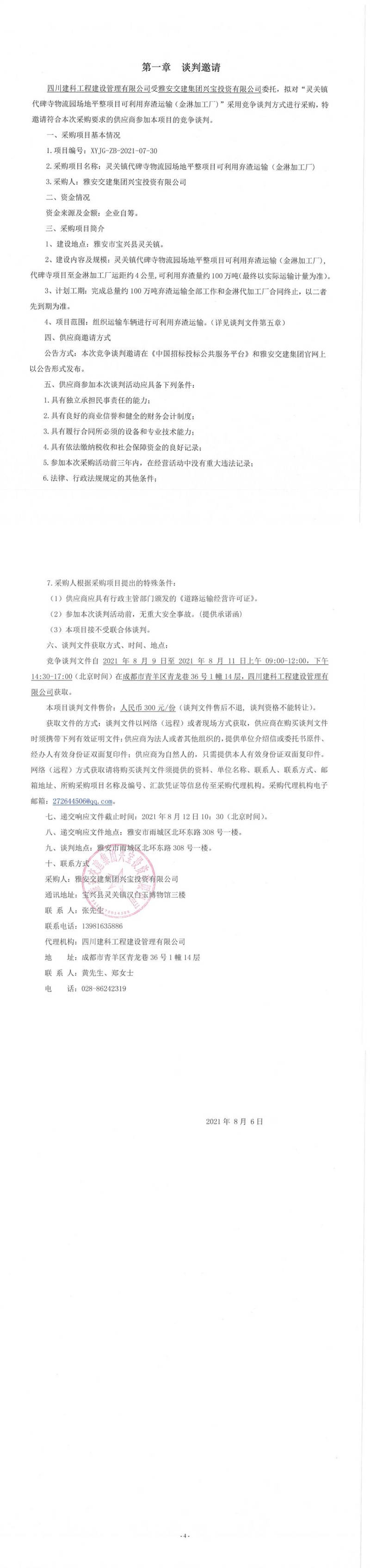 雅安交建集團(tuán)興寶投資有限公司靈關(guān)鎮(zhèn)代碑寺物流園場(chǎng)地平整項(xiàng)目可利用棄渣運(yùn)輸(金淋加工廠)競(jìng)爭(zhēng)談判公告