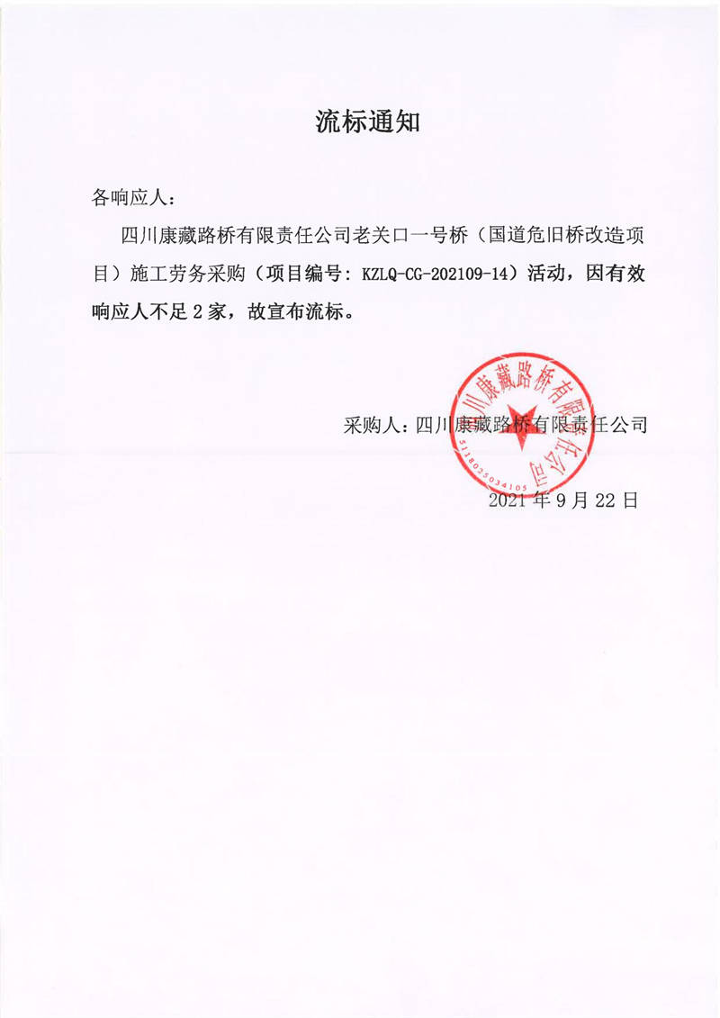 四川康藏路橋有限責任公司老關口一號橋(國道危舊橋改造項目)施工勞務采購流標通知