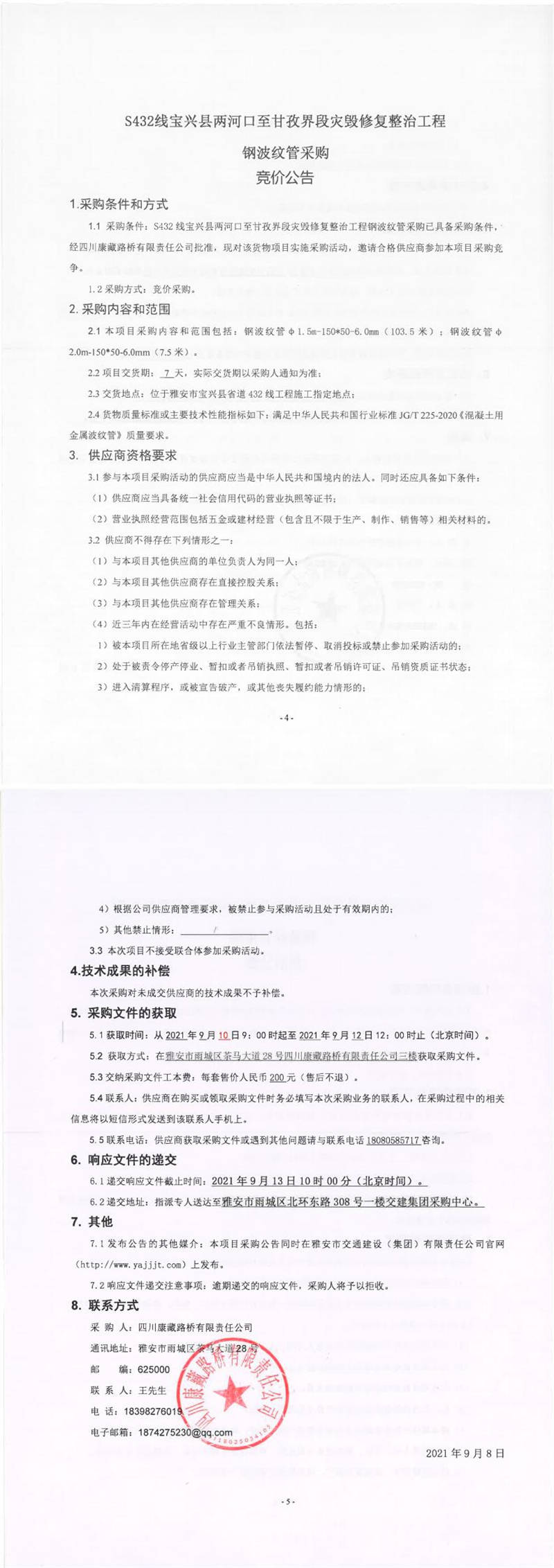 四川康藏路橋有限責(zé)任公司S432線寶興縣兩河口至甘孜界段災(zāi)毀修復(fù)整治工程鋼波紋管采購競(jìng)價(jià)公告