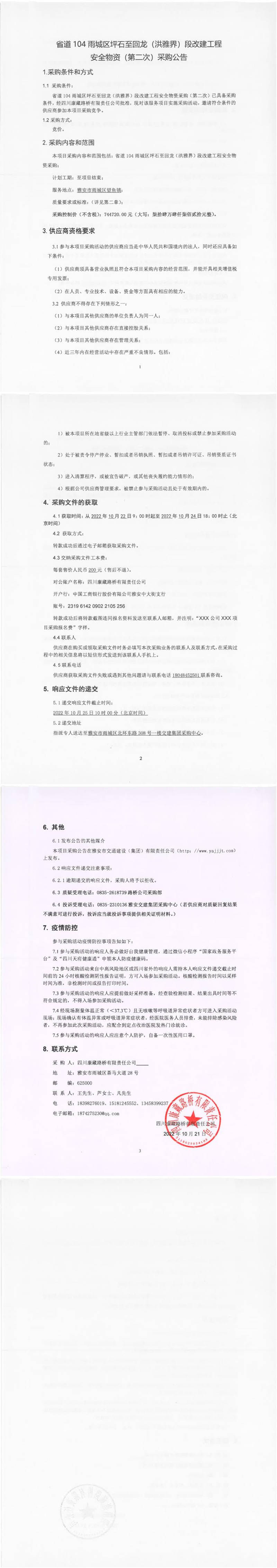 四川康藏路橋有限責(zé)任公司省道104雨城區(qū)坪石至回龍(洪雅界)段改建工程安全物資(第二次)采購公告