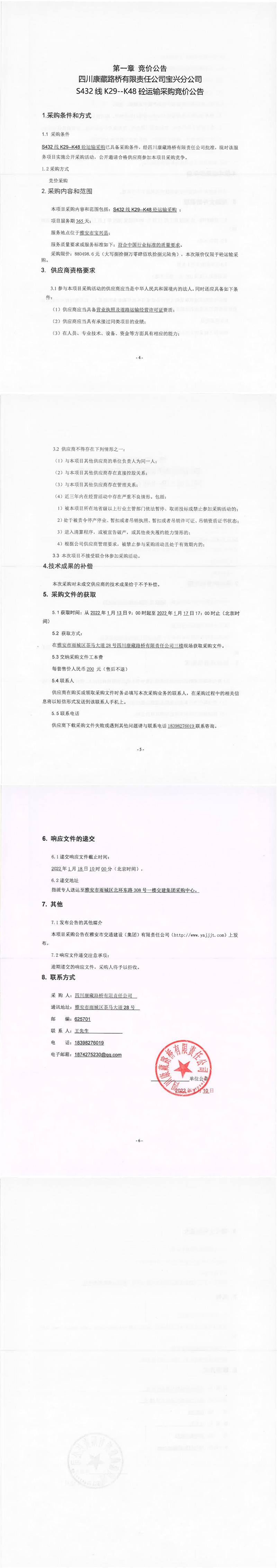 四川康藏路橋有限責任公司寶興分公司S432線K29-K48砼運輸采購競價公告