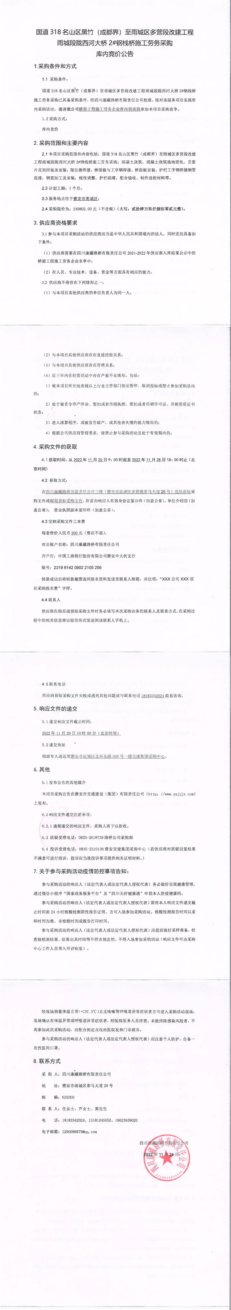 四川康藏路橋有限責(zé)任公司國(guó)道318名山區(qū)黑竹(成都界)至雨城區(qū)多營(yíng)段改建工程雨城段隴西河大橋2#鋼棧橋施工勞務(wù)采購(gòu)庫(kù)內(nèi)競(jìng)價(jià)公告