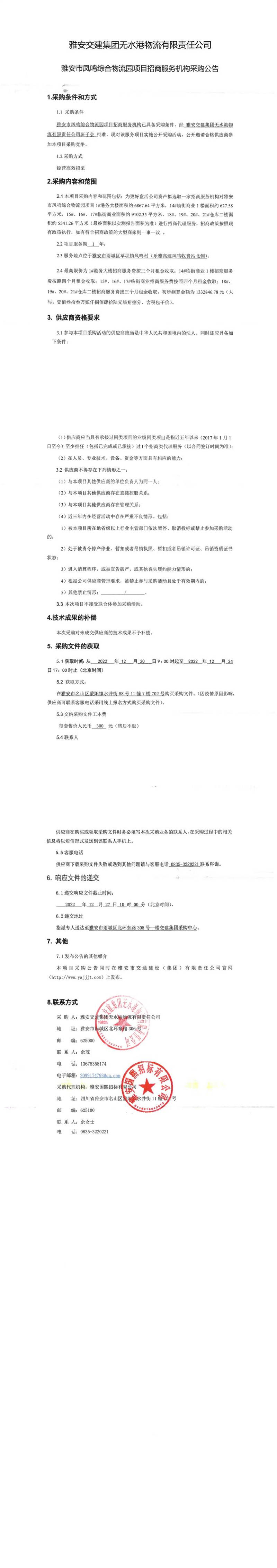 雅安交建集團(tuán)無(wú)水港物流有限責(zé)任公司雅安市鳳鳴綜合物流園項(xiàng)目招商服務(wù)機(jī)構(gòu)采購(gòu)公告