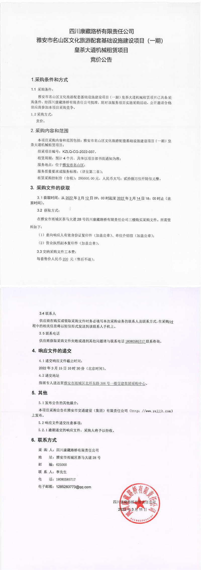 四川康藏路橋有限責任公司雅安市名山區(qū)文化旅游配套基礎(chǔ)設(shè)施建設(shè)項目(一期)皇茶大道機械租賃項目競價公告