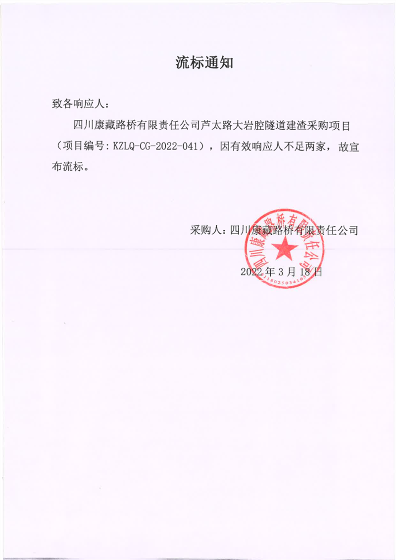 四川康藏路橋有限責任公司蘆太路大巖腔隧道建渣采購項目流標通知