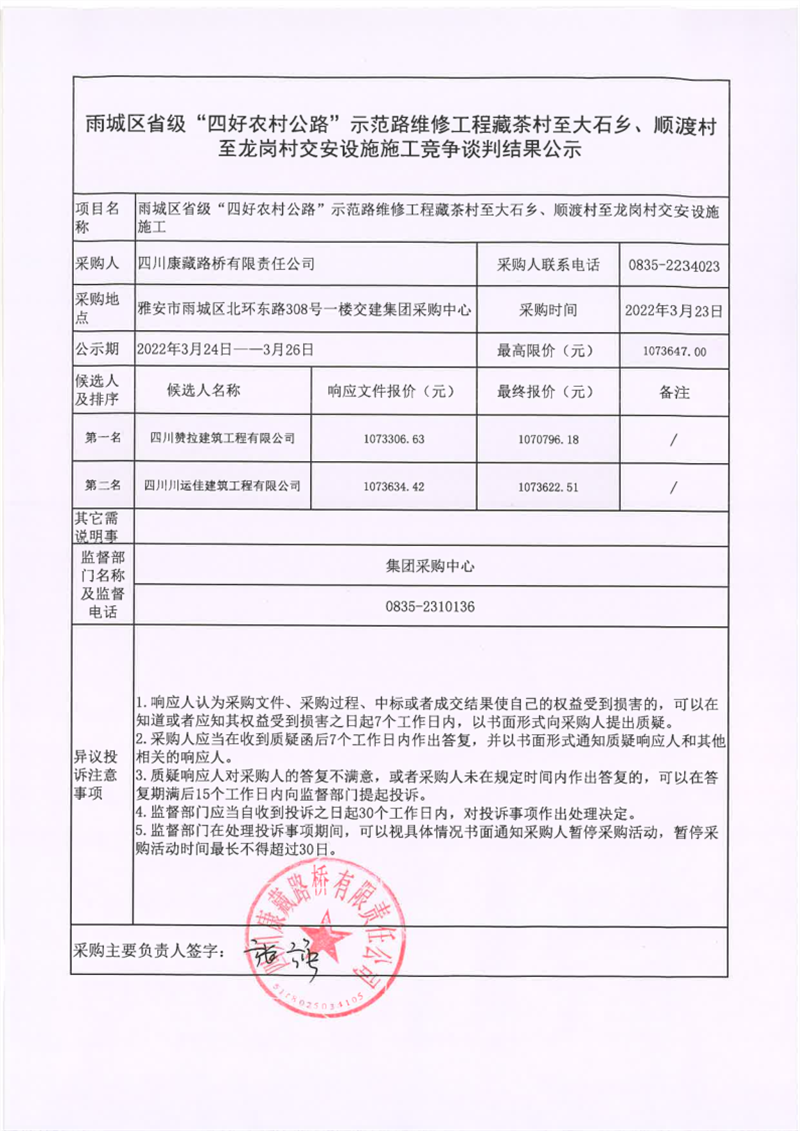 四川康藏路橋有限責任公司雨城區(qū)省級“四好農(nóng)村公路”示范路維修工程藏茶村至大石鄉(xiāng)、順渡村至龍崗村交安設施施工競爭談判結果公示