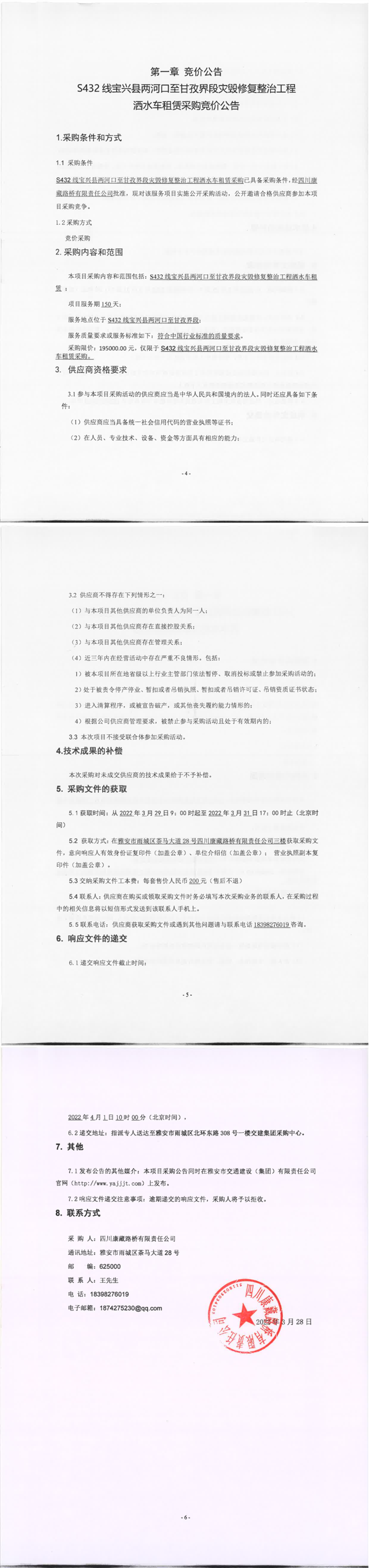四川康藏路橋有限責(zé)任公司S432線寶興縣兩河口至甘孜界段災(zāi)毀修復(fù)整治工程灑水車租賃采購競價公告