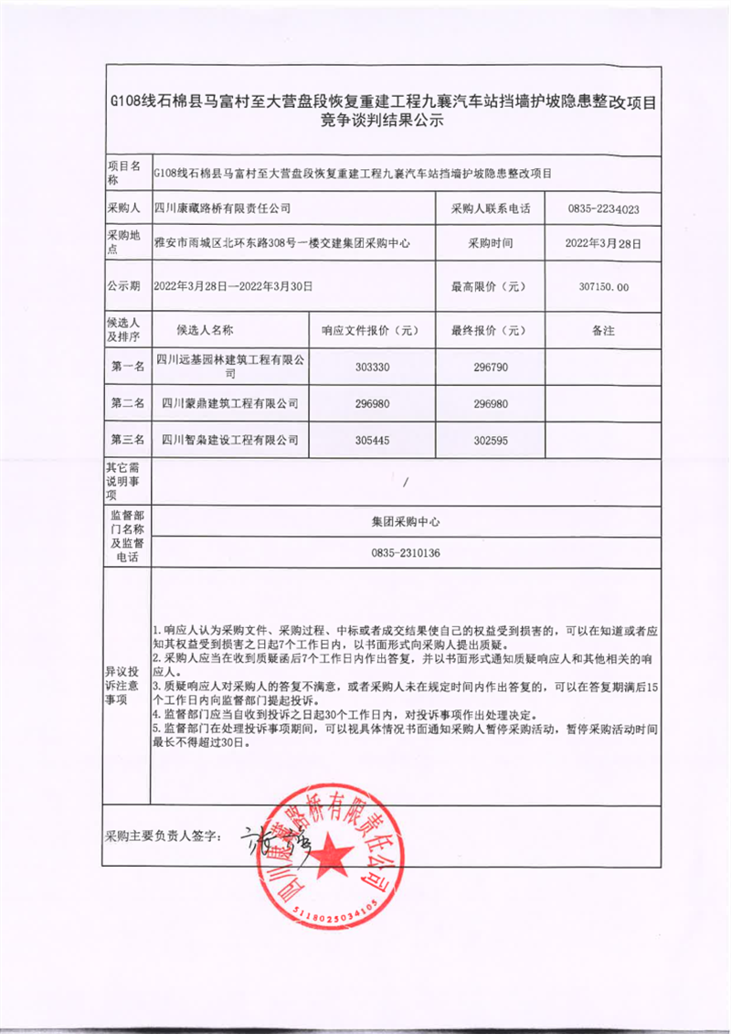 四川康藏路橋有限責(zé)任公司G108線石棉縣馬福村至大營盤段恢復(fù)重建九襄汽車站擋墻護坡隱患整改項目競爭談判結(jié)果公示